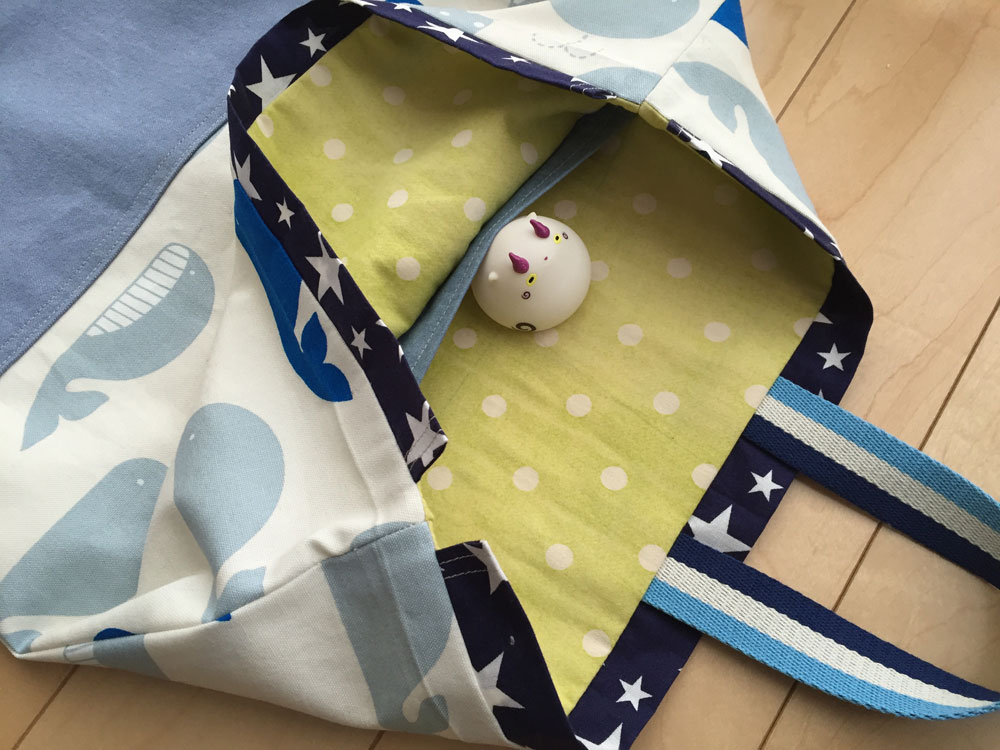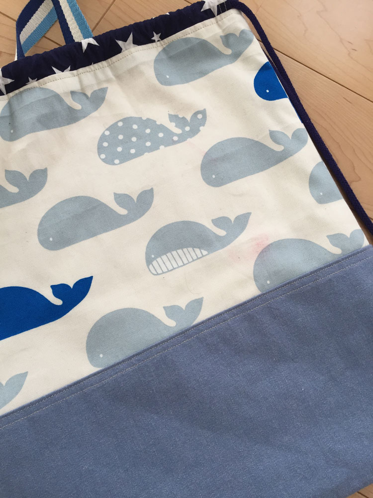 裁断(というか、計算)をミスしてクジラの生地を小さく切ってしまい・・・下の水色部分を多くする事で、ごまかしまして・・・結果。ポケットの収まりが悪くなったのでつけませんでした。あはははは。