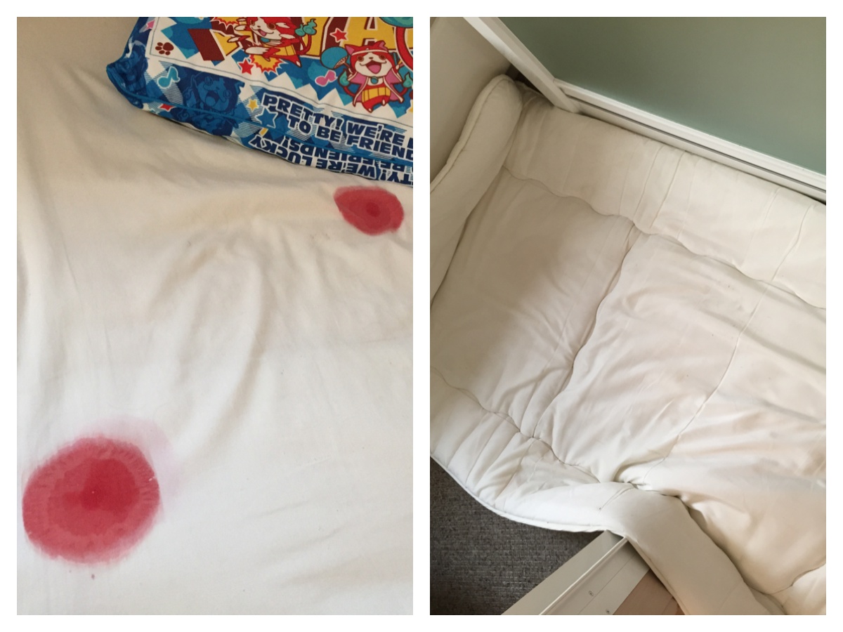 シーツを剥がして、中の布団もよごれていたので水を含ませたタオルでトントン。