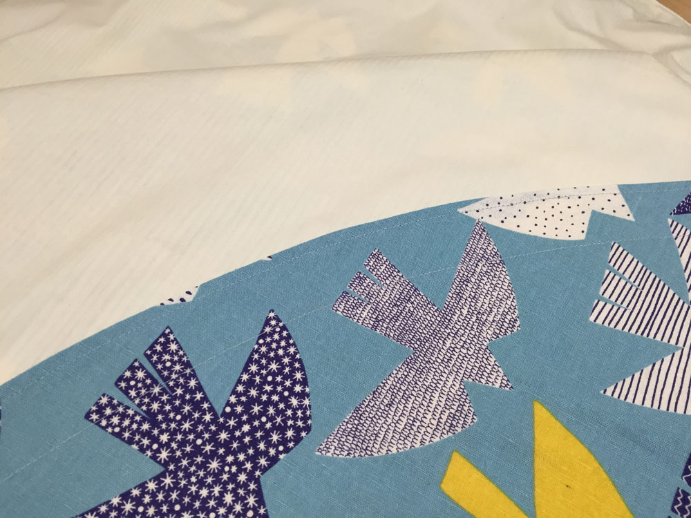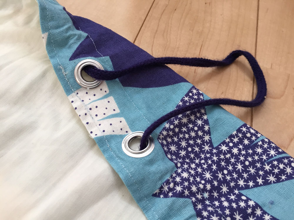 今回の使い方(片側の布だけに打つ)だと、金具や工具を出し入れしないといけないので外側の生地を閉じて縁を縫うのはハトメを打った後がいいですね。