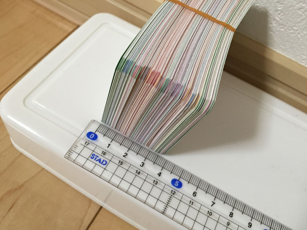 今回印刷したカードを切り離して束ねると、4cm近くもありました。