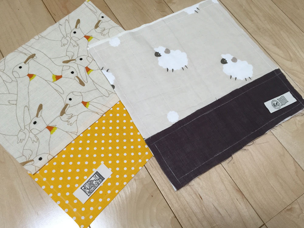 はぎ合せました。ペンギン×黄色ドット、羊×こげ茶です。